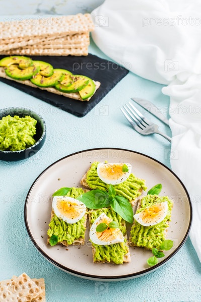 Аппетитные хрустящие бутерброды с авокадо и вареным яйцом на тарелке. Вертикальный вид