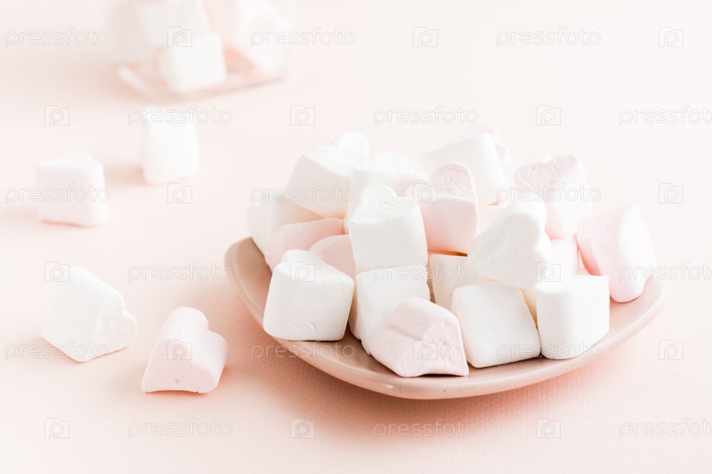 Белые и розовые зефирки в форме сердца на блюдце на розовом фоне