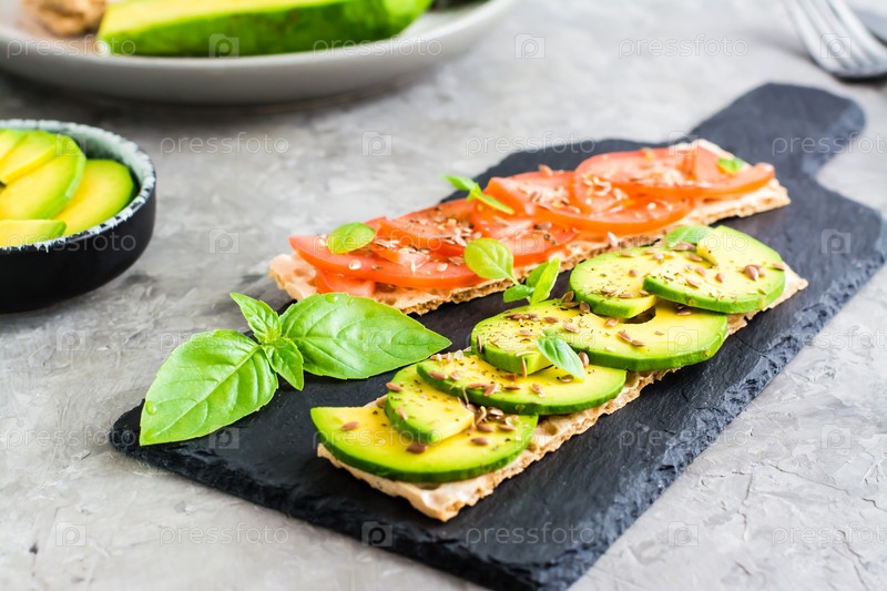 Аппетитные бутерброды с авокадо и помидорами на зерновом хлебе на грифельной доске