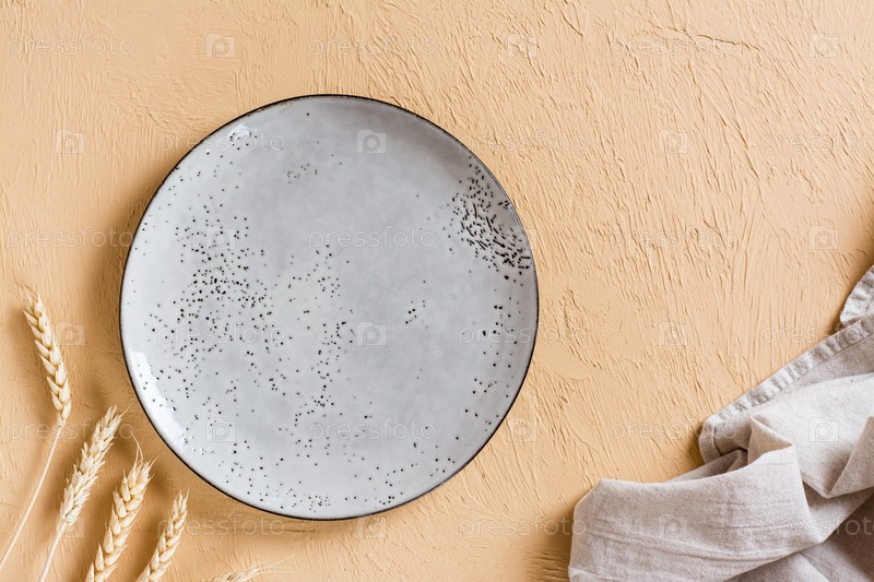 Пустая керамическая тарелка и сухие уши на текстурированном фоне. Вид сверху. Экологичная концепция