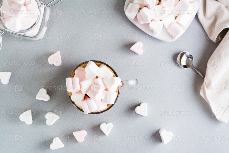 Сладкий какао с зефиром в форме сердца в чашке на столе. Вид сверху
