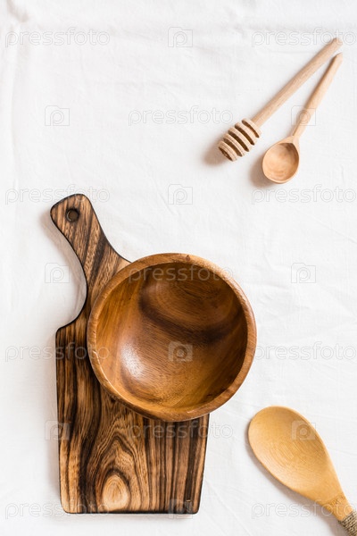 Пустая деревянная миска на разделочной доске и деревянные ложки на ткани. Верхний и вертикальный вид