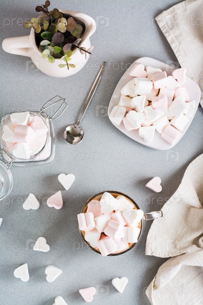 Сладкий какао с зефиром в форме сердца в чашке и блюдце. Верхний и вертикальный вид
