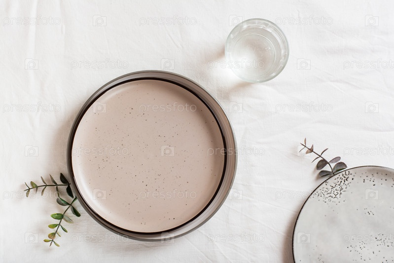 Набор пустых керамических тарелок, стакан воды и ветки эвкалипта на белой ткани