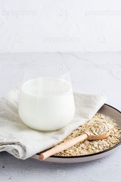 Овсяное молоко в стакане на тарелке с сухой овсянкой на светлом столе. Альтернативная растительная пища. Вертикальный вид