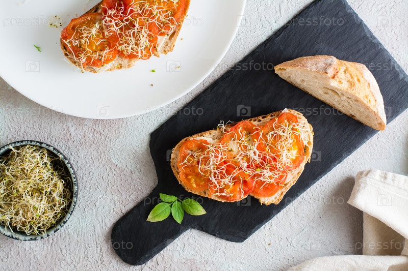 Готовый бутерброд с вялеными помидорами и ростками клевера и люцерны на столе. Диетическое органическое питание. Вид сверху