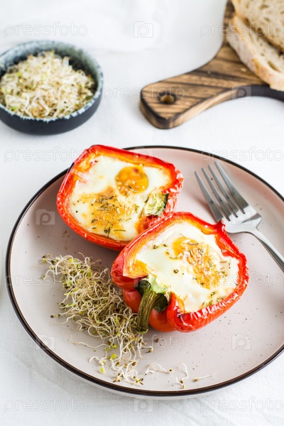 Готовые к употреблению половинки болгарского перца, запеченные с яйцом и микрозеленью, на тарелке на столе. Здоровая органическая диета. Вертикальный вид