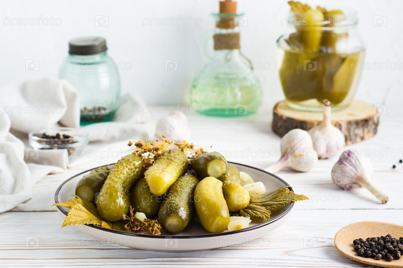 Маринованные огурцы на тарелке и ингредиенты для приготовления пищи на деревянном столе. Домашние закуски