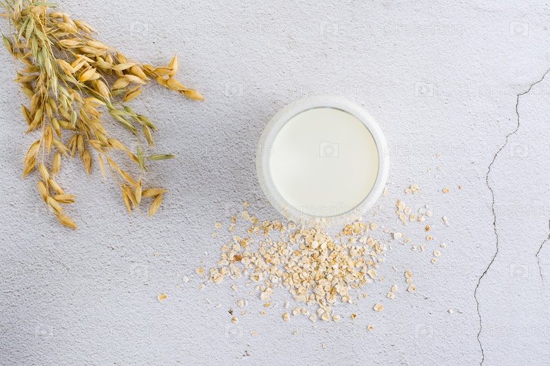 Овсяное молоко в стакане, уши и разбросанная сухая овсянка на светлом столе. Альтернативная растительная пища. Вид сверху