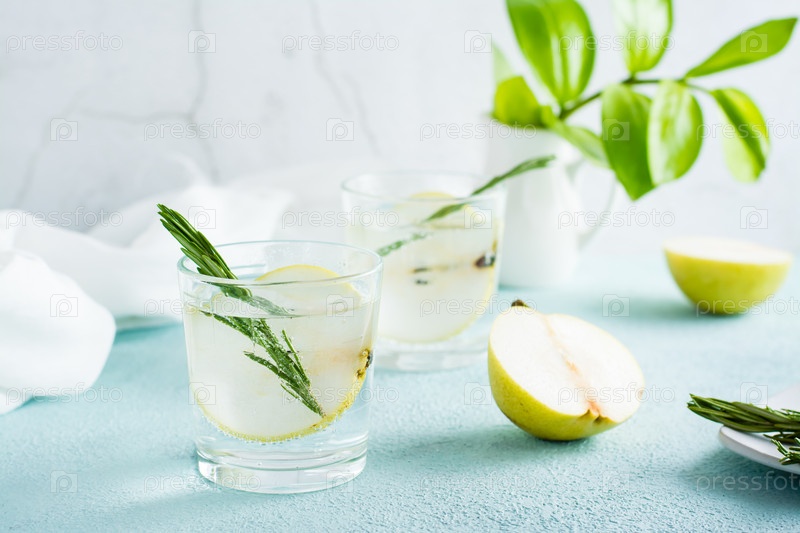 Освежающий коктейль из минеральной воды и кусочков груши в стаканах на столе. Домашние напитки