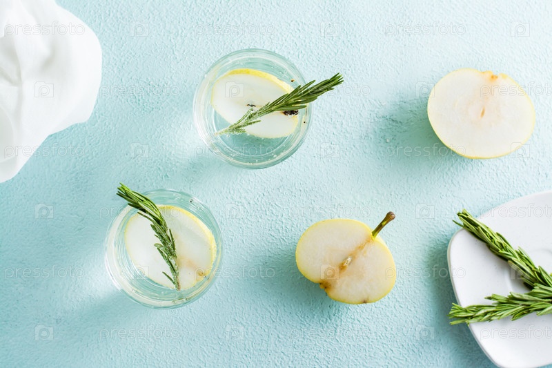 Освежающий коктейль из минеральной воды и кусочков груши в стаканах на столе. Домашние напитки. Вид сверху