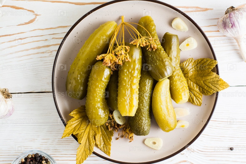 Готовые к употреблению маринованные огурцы на тарелке и ингредиенты для приготовления пищи на деревянном столе. Домашние закуски. Вид сверху. Крупный план