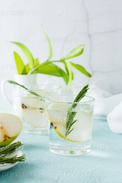 Холодный коктейль из ломтиков груши и минеральной воды в стаканах на столе. Домашние напитки. Вертикальный вид
