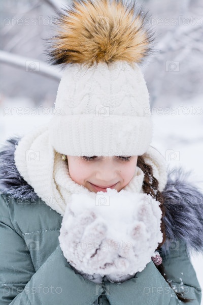 Девушка в теплой одежде держит в руках снег в перчатках в зимнем парке. Портрет зимнего образа жизни. Вертикальный вид