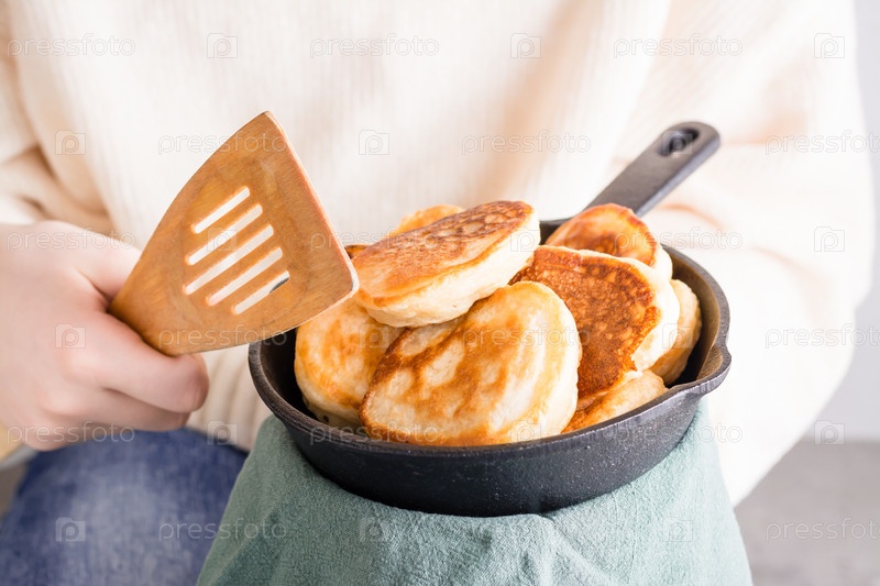 Ребенок держит в руках сковороду с блинами и лопаточку для жарки. Образ жизни с едой