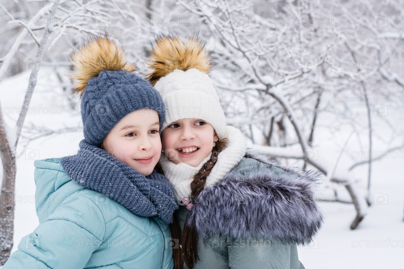 Две улыбающиеся девушки в теплой одежде обнимаются в заснеженном парке. Зимние прогулки, образ жизни