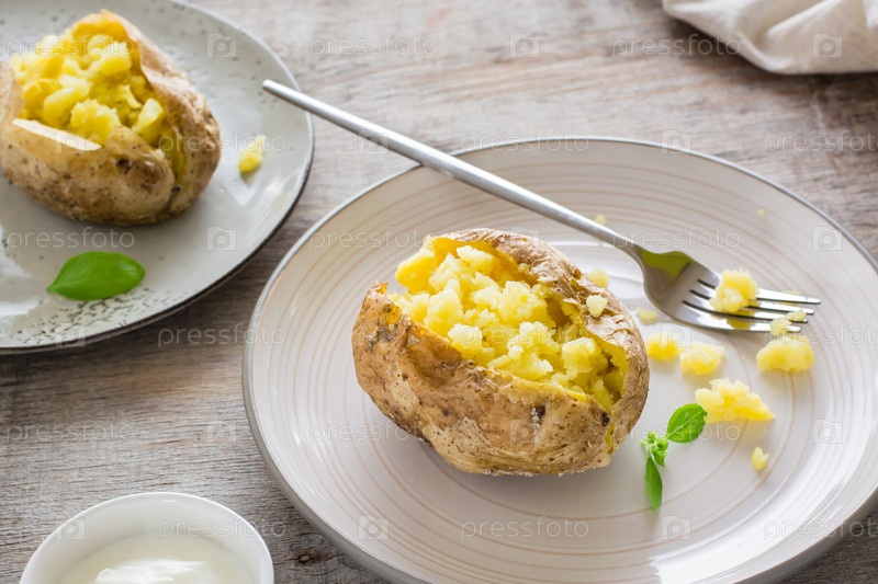Печеный картофель в мундире на тарелках и миска со сметаной на деревянном столе. Вегетарианская натуральная пища. Крупный план