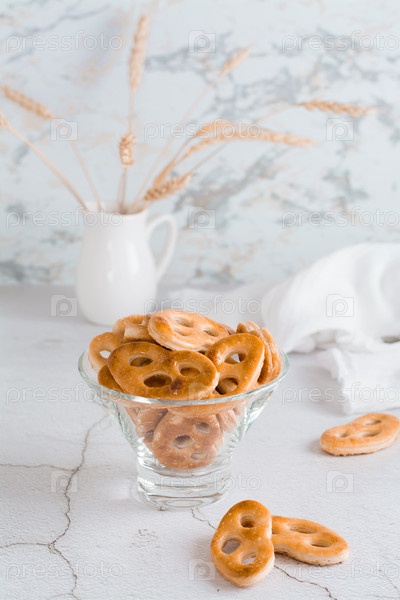 Баварские крендельки в стеклянной посуде на столе. Закуска для фаст-фуда. Вертикальный вид