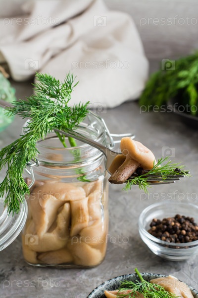 Маринованные грибы на вилке на банке с белыми грибами и укропом и в стеклянной банке на столе. Вегетарианская органическая пища. Вертикальный вид. Крупный план