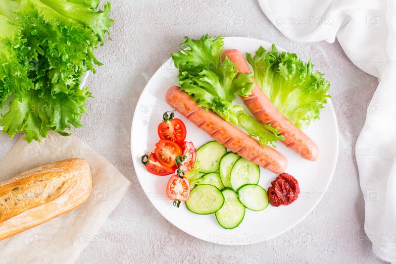 Готовые к употреблению жареные колбаски и свежие овощи на тарелке на столе. Сытный домашний перекус. Вертикальный вид. Вид сверху