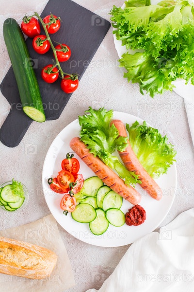 Жареные сосиски, нарезанные помидоры и огурцы на тарелке и булочка на столе. Сытный домашний перекус. Верхний и вертикальный вид