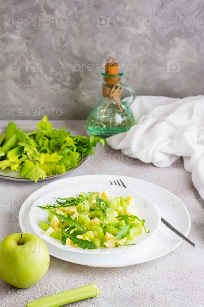 Готовый к употреблению свежий салат из сельдерея, зеленого яблока, рукколы и семян кунжута на тарелках на столе. Вегетарианская диета. Вертикальный вид