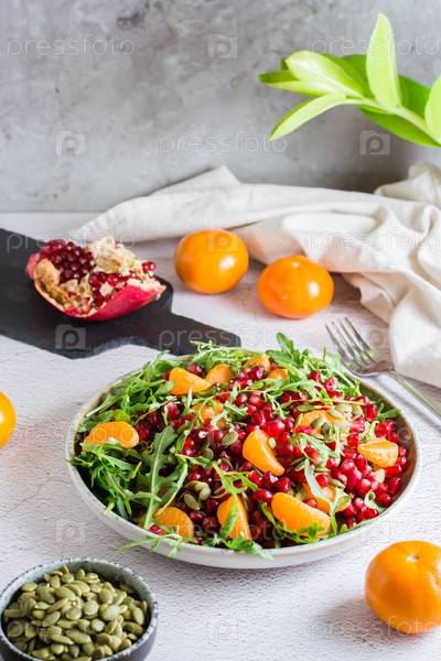 Фруктовый витаминный салат из граната, мандарина, рукколы и семян тыквы в тарелке на столе. Органическая вегетарианская еда. Вертикальный вид