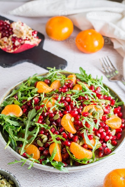 Фруктовый витаминный салат из граната, мандарина, рукколы и семян тыквы в тарелке на столе. Органическая вегетарианская еда. Вертикальный вид. Крупный план