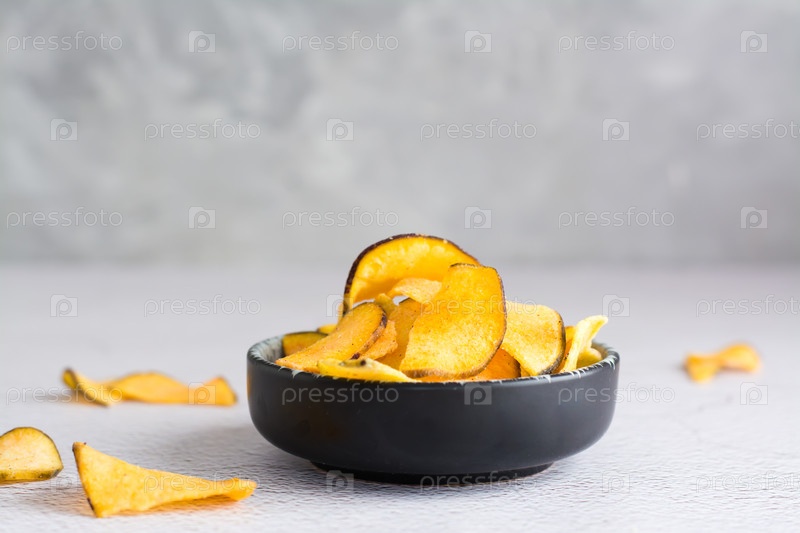Аппетитные чипсы из сладкого картофеля в миске на столе. Домашняя закуска. Копировать пространство