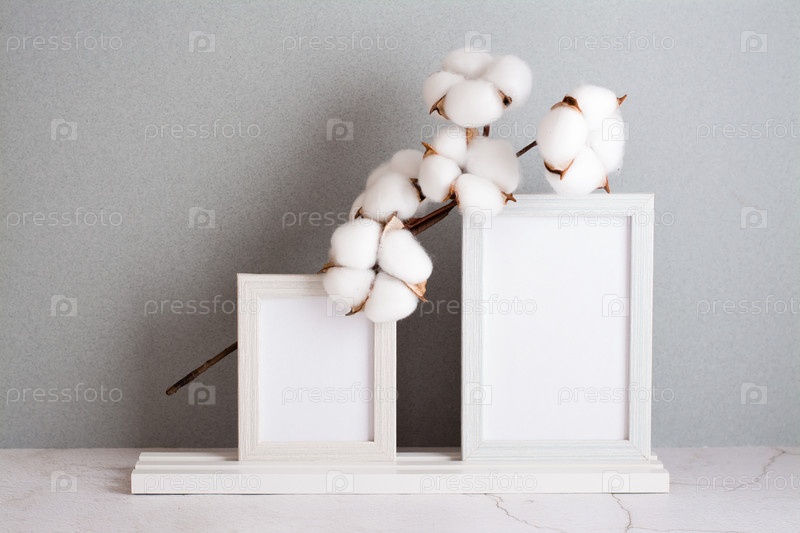 Экологически чистый домашний декор две фоторамки и хлопковая ветка на столе на сером фоне. Пастельные тона