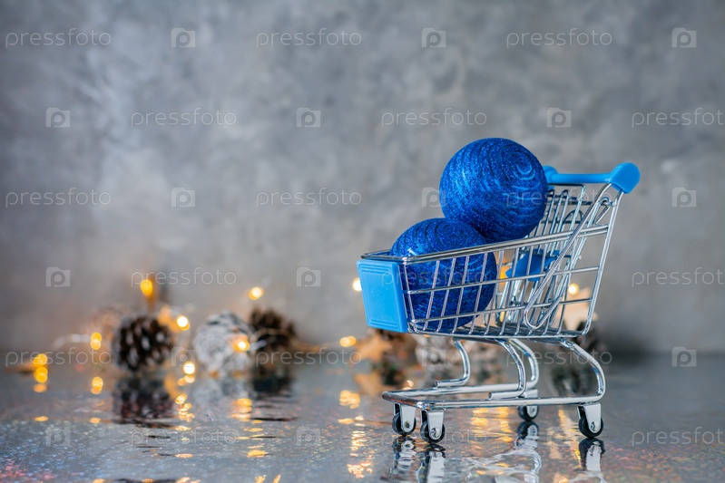 Праздничный шопинг. Корзина с синими блестящими шариками на сером фоне с гирляндой и огнями. Рождественская концепция