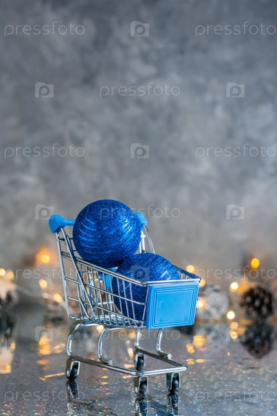 Праздничный шоппинг. Корзина с синими блестящими шариками на сером фоне с гирляндой и огнями. Рождественская концепция. Вертикальный вид