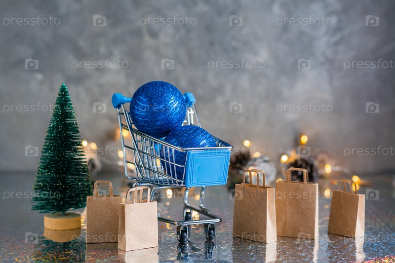 Праздничный шопинг. Корзина с синими блестящими шарами, елкой и бумажными пакетами на сером фоне с гирляндой и огнями. Рождественская концепция