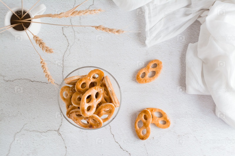 Баварские крендельки в стеклянной посуде на столе. Закуска для фаст-фуда. Вид сверху