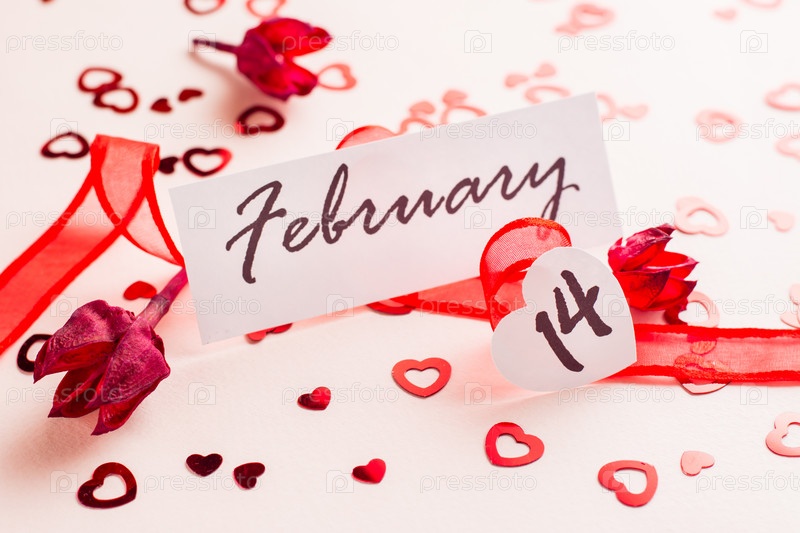 День Святого Валентина. Дата 14 февраля стоит в красной ленте и сухом цветке на розовом фоне, усыпанном сердечками