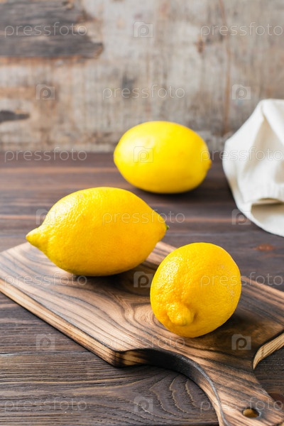 Целые спелые лимоны на деревянной разделочной доске на столе. Органическое питание, источник витаминов. Вертикальный вид