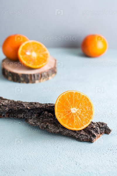 Спелый мандарин разрезать пополам на коре дерева и мандарины позади на голубом фоне. Экологически чистые фрукты. Вертикальный вид