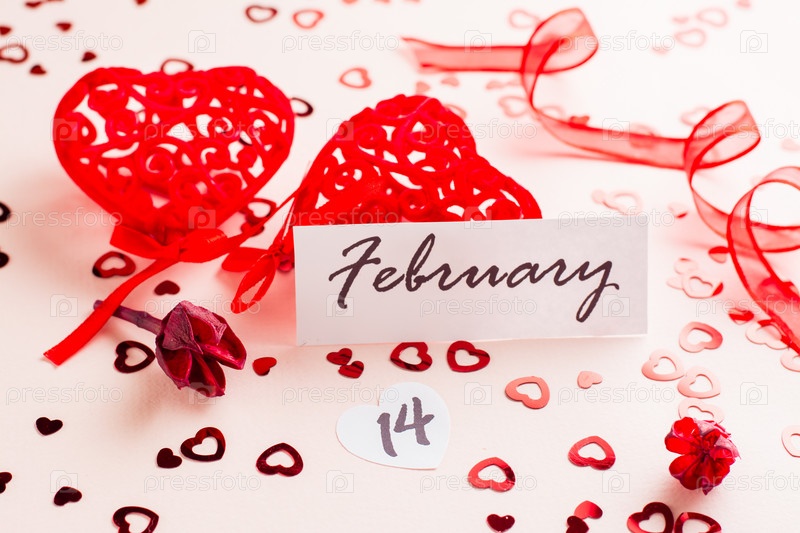 День Святого Валентина. Дата 14 февраля, сухой цветок и красные кудрявые сердечки на розовом фоне, усыпанном сердечками