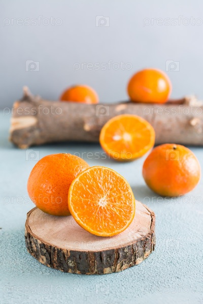 Спелый мандарин, разрезанный пополам на спиле дерева, и мандарины рядом на синем фоне. Экологически чистые фрукты. Вертикальный вид