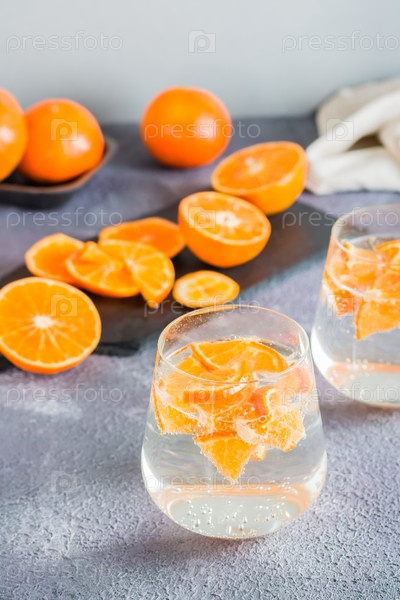 Освежающий напиток минеральной воды с кусочками мандарина в стаканах и спелыми фруктами рядом на столе. Детокс питание. Вертикальный вид