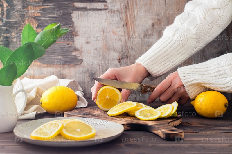 Женские руки режут спелые лимоны на деревянной разделочной доске и кусочки на тарелке на столе. Органическое питание, источник витаминов