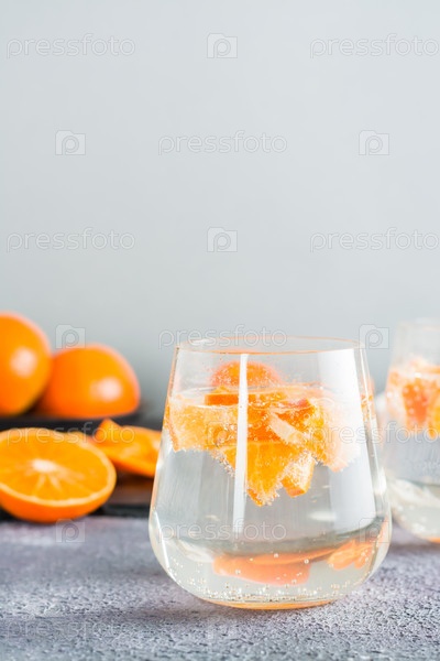 Безалкогольный коктейль минеральная вода с кусочками мандаринов в стакане и спелыми фруктами рядом на столе. Детокс питание. Скопируйте пространство. Вертикальный вид