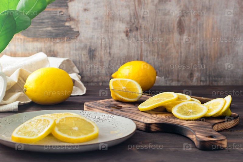 Нарезка спелых лимонов на деревянной разделочной доске и кусочки на тарелке на столе. Органическое питание, источник витаминов