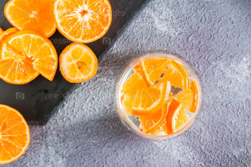 Безалкогольный коктейль минеральная вода с кусочками мандаринов в стакане и спелыми фруктами рядом на столе. Детокс питание. Вид сверху