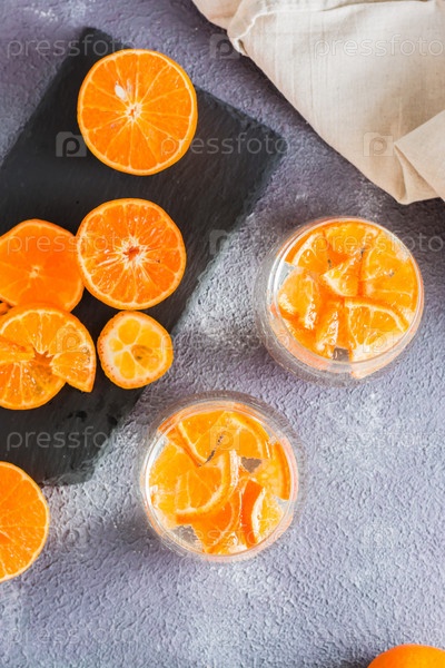 Безалкогольный коктейль минеральная вода с кусочками мандаринов в стаканах и спелыми фруктами рядом на столе. Детокс питание. Верхний и вертикальный вид