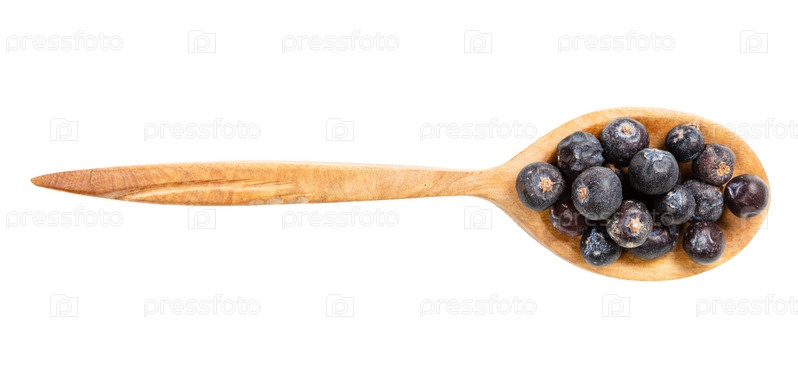 Вид сверху на деревянную ложку с сушеными ягодами можжевельника