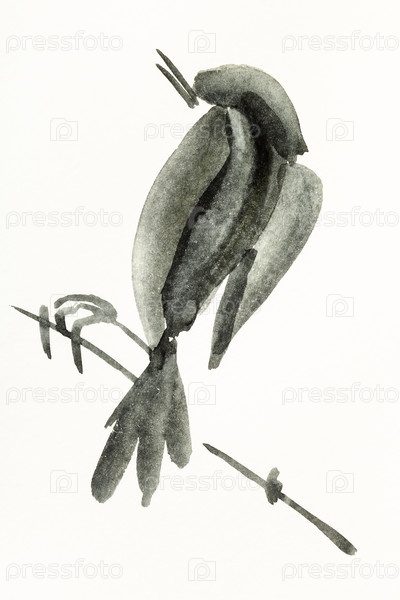 Птица на ветке нарисована от руки на кремовой бумаге