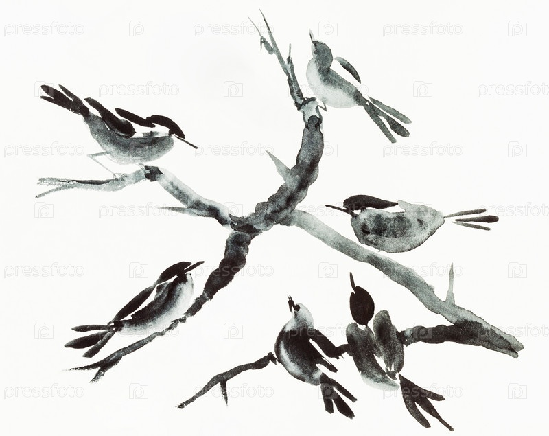 Птицы на дереве нарисованы от руки на кремовой бумаге