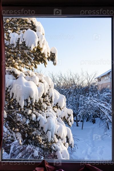 Вид на заснеженный двор через окно