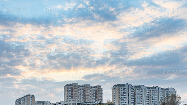 Голубое закатное небо над высотным жилым домом
